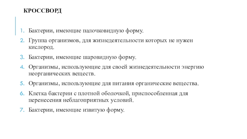КРОССВОРД Бактерии, имеющие палочковидную форму. Группа организмов, для жизнедеятельности которых не нужен кислород.Бактерии, имеющие шаровидную форму.Организмы, использующие для