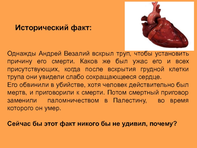 Однажды Андрей Везалий вскрыл труп, чтобы установить причину его смерти. Каков же был ужас его и всех присутствующих, когда после вскрытия грудной клетки трупа они увидели слабо сокращающееся сердце.