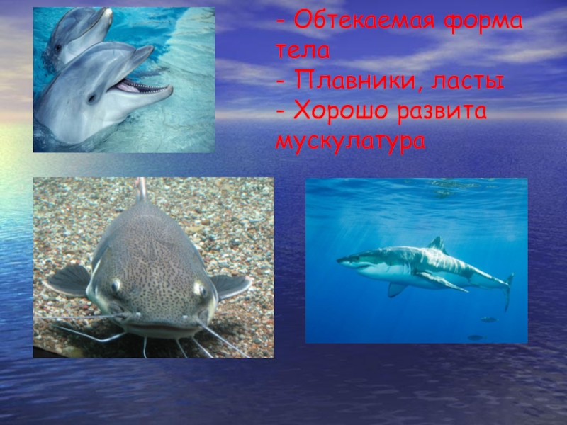 - Обтекаемая форма тела - Плавники, ласты - Хорошо развита мускулатура