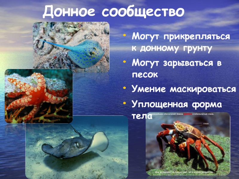 Донное сообществоМогут прикрепляться к донному грунтуМогут зарываться в песокУмение маскироватьсяУплощенная форма тела