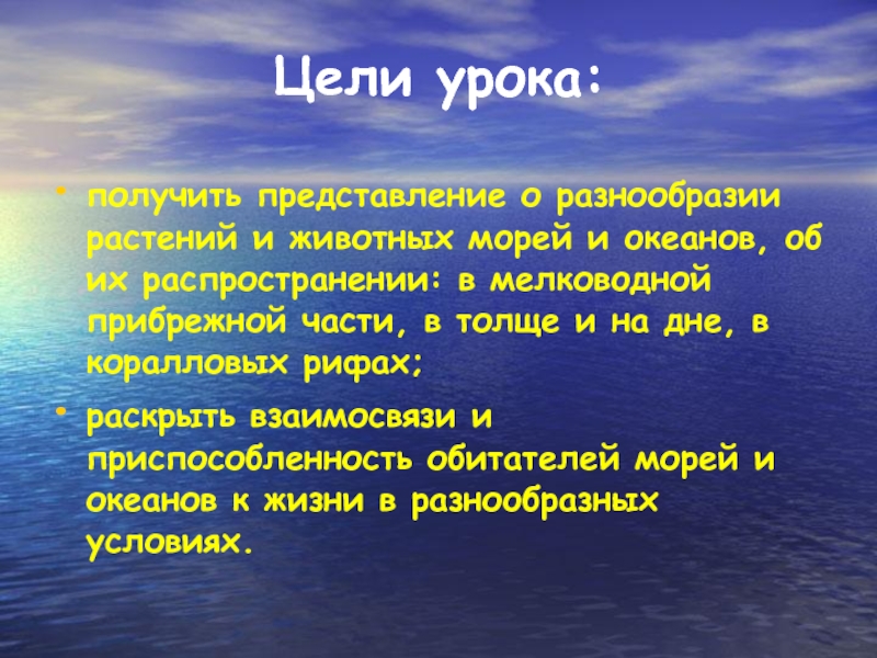 Цели урока:получить представление о разнообразии растений и животных морей и океанов, об их распространении: в мелководной прибрежной части, в толще и на дне, в коралловых рифах; раскрыть взаимосвязи и приспособленность обитателей морей и океанов к жизни