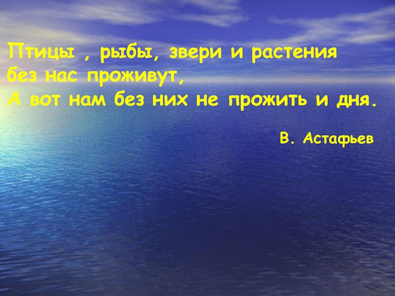 Птицы , рыбы, звери и растения без нас проживут,А вот нам без них не прожить и дня.