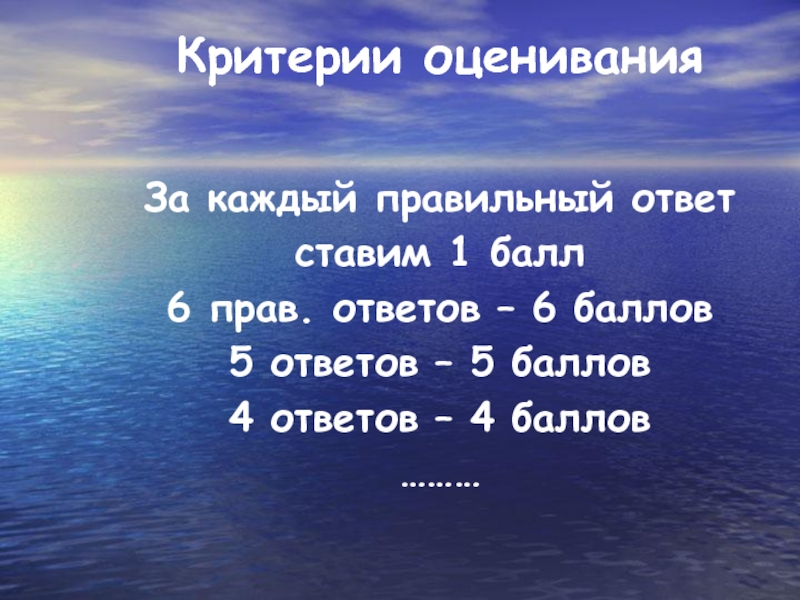 Слайд 7Критерии оценивания За каждый правильный ответ ставим 1 балл 6 прав. ответов – 6