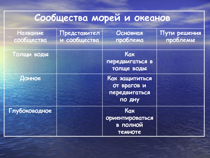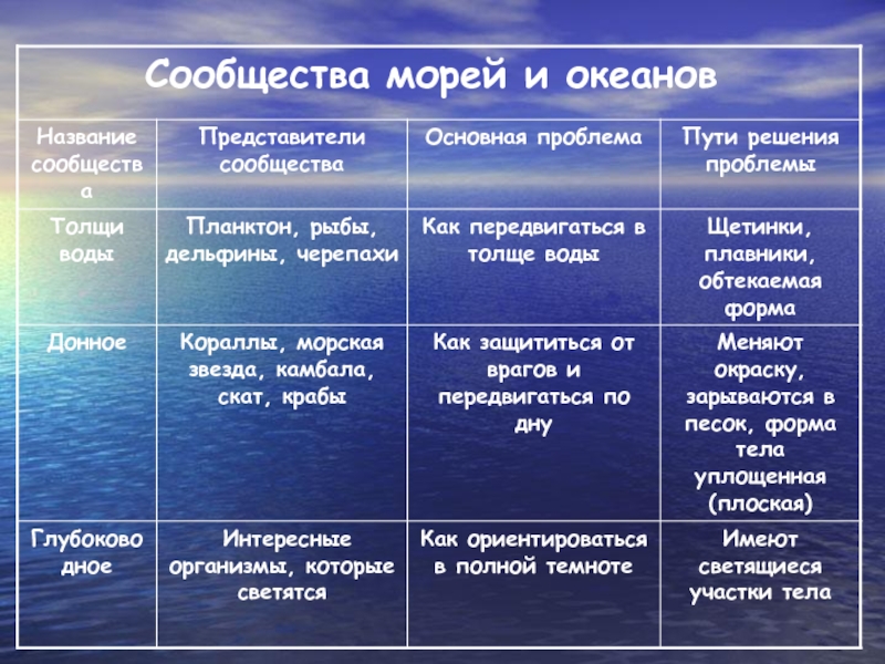 раскрыть взаимосвязи и приспособленность обитателей морей и океанов к жизни в разнообразных условиях.