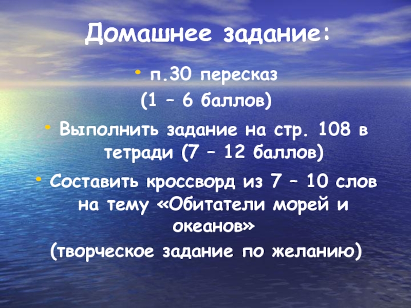 Домашнее задание:п.30 пересказ(1 – 6 баллов)Выполнить задание на стр. 108 в тетради (7