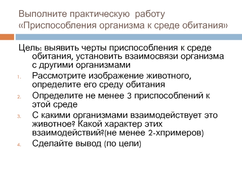 Слайд 7Выполните практическую работу «Приспособления организма к среде обитания»