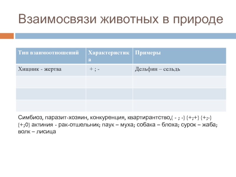 Взаимосвязи животных в природеСимбиоз, паразит-хозяин, конкуренция, квартирантство,( - ; -) (+;+) (+;-) (+;0) актиния - рак-отшельник; паук