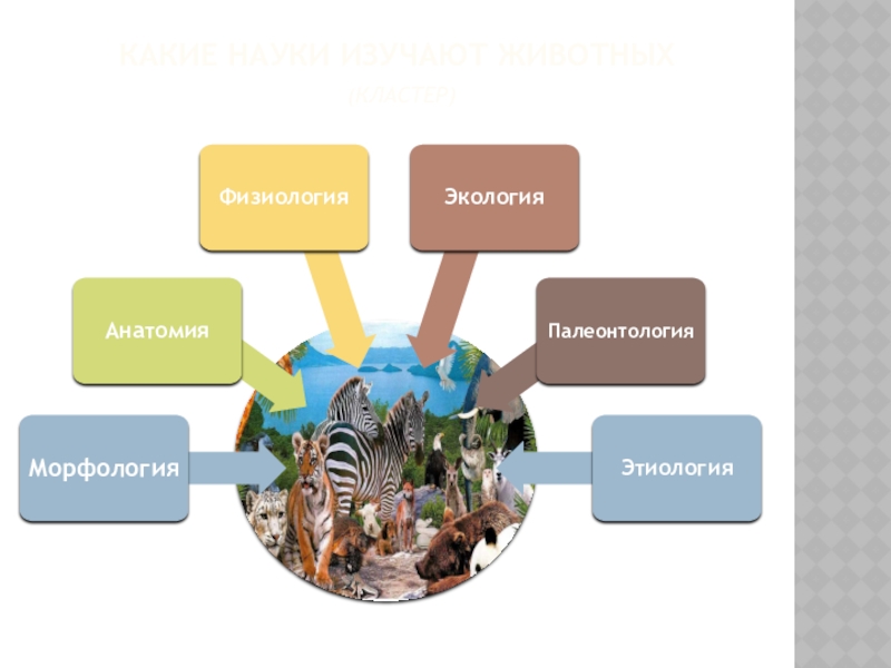Какие науки изучают животных  (кластер)МорфологияАнатомияФизиология ЭкологияПалеонтологияЭтиология