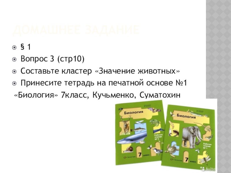 Домашнее задание§ 1Вопрос 3 (стр10)Составьте кластер «Значение животных»Принесите тетрадь на печатной основе №1«Биология» 7класс, Кучьменко, Суматохин
