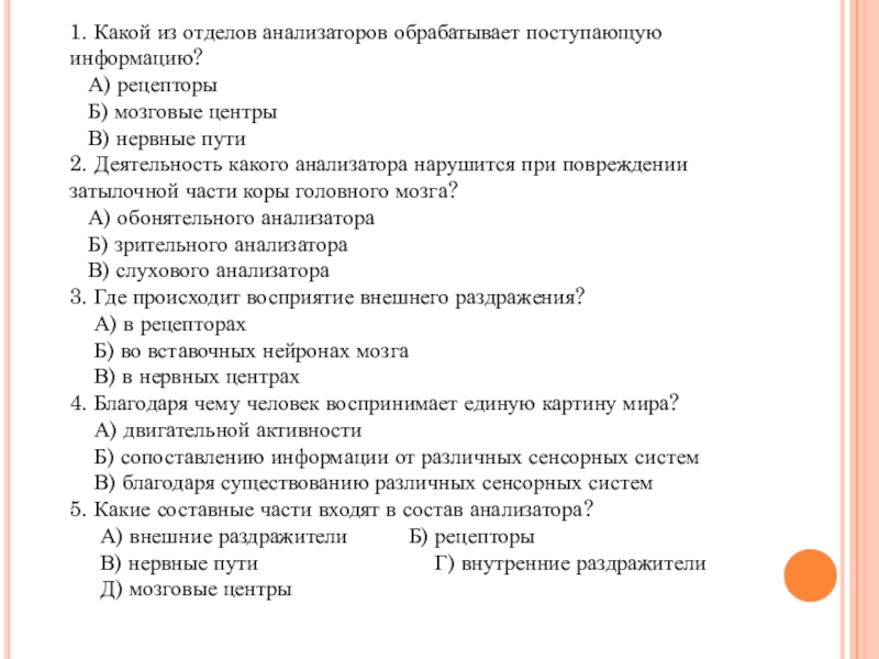 1. Какой из отделов анализаторов обрабатывает поступающую информацию?  А) рецепторы  Б) мозговые центры  В)