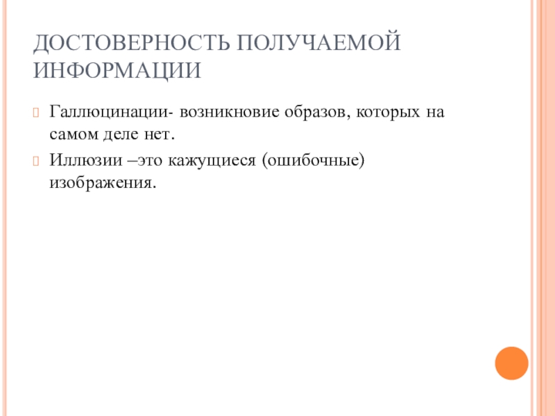 ДОСТОВЕРНОСТЬ ПОЛУЧАЕМОЙ ИНФОРМАЦИИГаллюцинации- возникновие образов, которых на самом деле нет.Иллюзии –это кажущиеся (ошибочные) изображения.