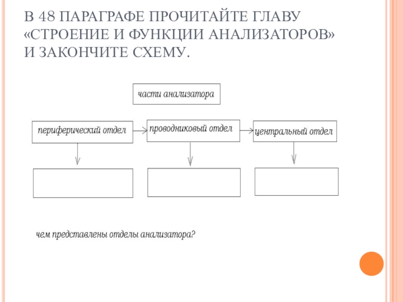 В 48 ПАРАГРАФЕ ПРОЧИТАЙТЕ ГЛАВУ «СТРОЕНИЕ И ФУНКЦИИ АНАЛИЗАТОРОВ» И ЗАКОНЧИТЕ СХЕМУ.