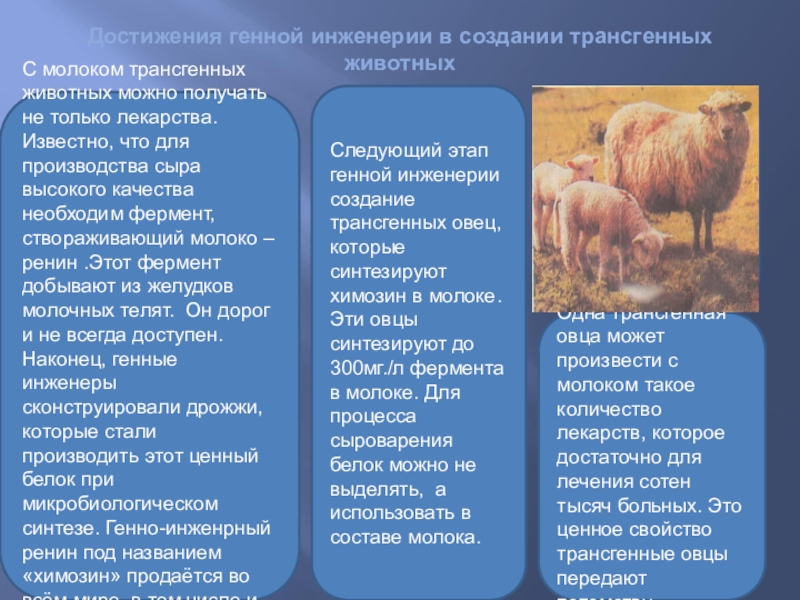 Следующий этап генной инженерии создание трансгенных овец, которые синтезируют химозин в молоке. Эти овцы синтезируют до 300мг./л фермента в молоке. Для процесса сыроварения белок можно не выделять, а использовать в составе молока.