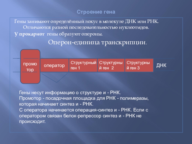 С оператора начинается операция-синтез и - РНК. Если с оператором связан белок-репрессор синтез и - РНК не происходит.