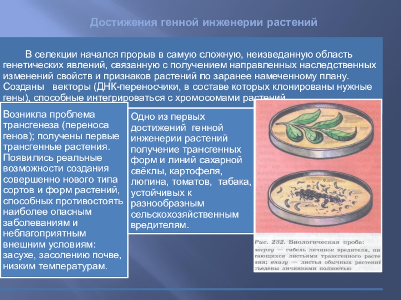 Одним из первых примеров успешного создания трансгенных животных было получение мышей, в геном которых встроен ген гормона роста крысы. Такие мыши росли быстро и достигали размеров существенно превышающих размеры контрольных животных.