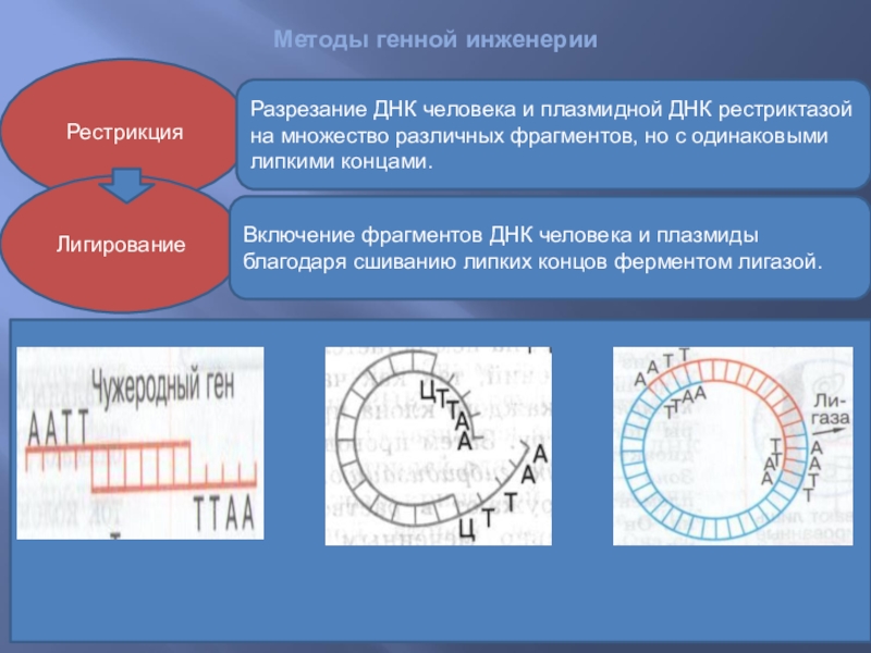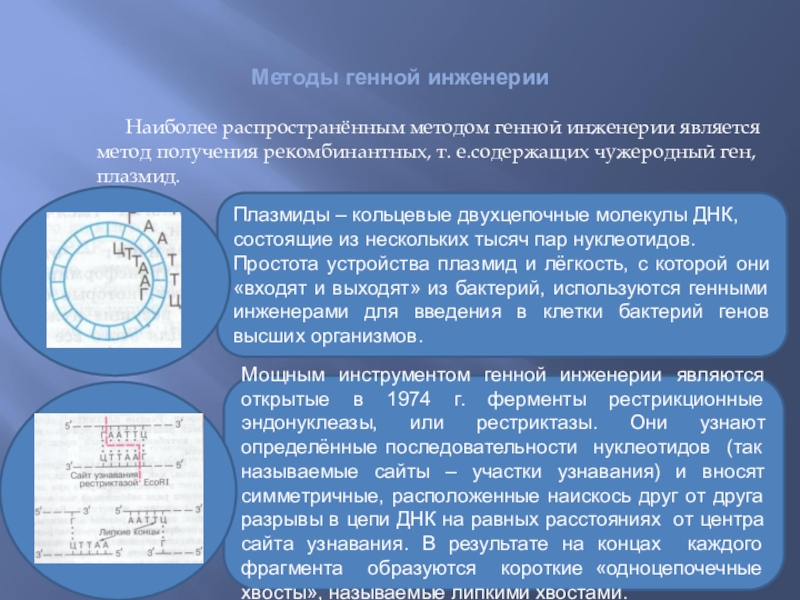 Мощным инструментом генной инженерии являются открытые в 1974 г. ферменты рестрикционные эндонуклеазы, или рестриктазы. Они узнают определённые последовательности нуклеотидов (так называемые сайты – участки узнавания) и вносят симметричные, расположенные наискось друг от друга разрывы в цепи ДНК на равных расстояниях от центра сайта узнавания. В результате на концах каждого фрагмента образуются короткие «одноцепочечные хвосты», называемые липкими хвостами.