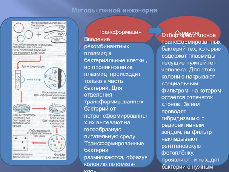 Отбор среди клонов трансформированных бактерий тех, которые содержат плазмиды, несущие нужный ген человека. Для этого колонию накрывают специальным фильтром на котором остаётся отпечаток клонов. Затем проводят гибридизацию с радиоактивным зондом, на фильтр накладывают рентгеновскую фотоплёнку, проявляют и находят бактерии с нужным геном.