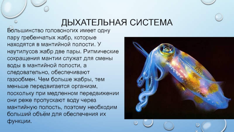 мантийной полости. У наутилусов жабр две пары. Ритмические сокращения мантии служат для смены воды в мантийной полости, а следовательно, обеспечивают газообмен. Чем больше жабры, тем меньше передвигается организм, поскольку при медленном передвижении они реже пропускают воду через мантийную полость, поэтому необходим больший объём для обеспечения их функции.