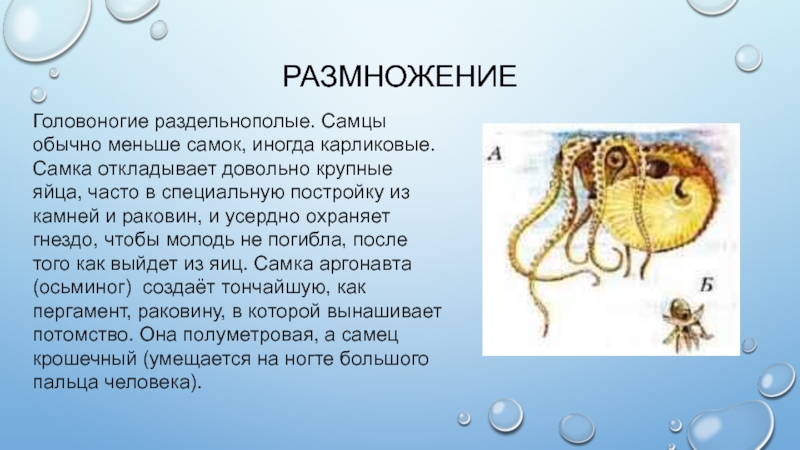 крупные яйца, часто в специальную постройку из камней и раковин, и усердно охраняет гнездо, чтобы молодь не погибла, после того как выйдет из яиц. Самка аргонавта (осьминог) создаёт тончайшую, как пергамент, раковину, в которой вынашивает потомство. Она полуметровая, а самец крошечный (умещается на ногте большого пальца человека).