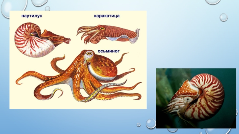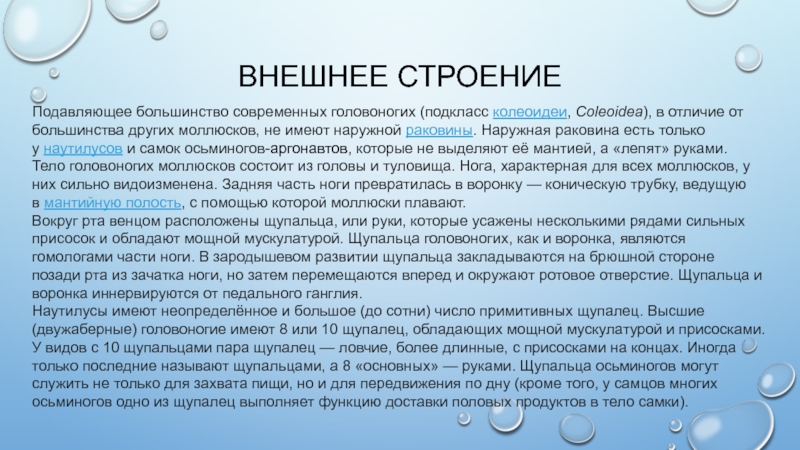 моллюсков, не имеют наружной раковины. Наружная раковина есть только у наутилусов и самок осьминогов-аргонавтов, которые не выделяют её мантией, а «лепят» руками.
