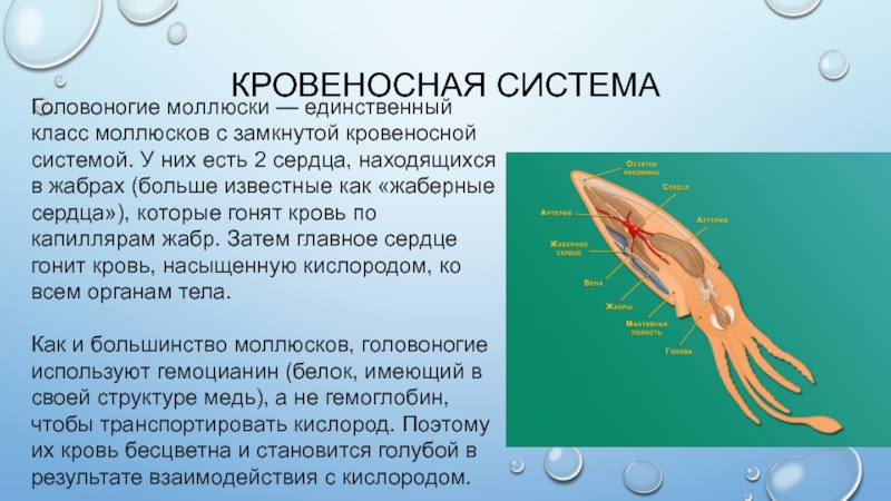 Как и большинство моллюсков, головоногие используют гемоцианин (белок, имеющий в своей структуре медь), а не гемоглобин, чтобы транспортировать кислород. Поэтому их кровь бесцветна и становится голубой в результате взаимодействия с кислородом.