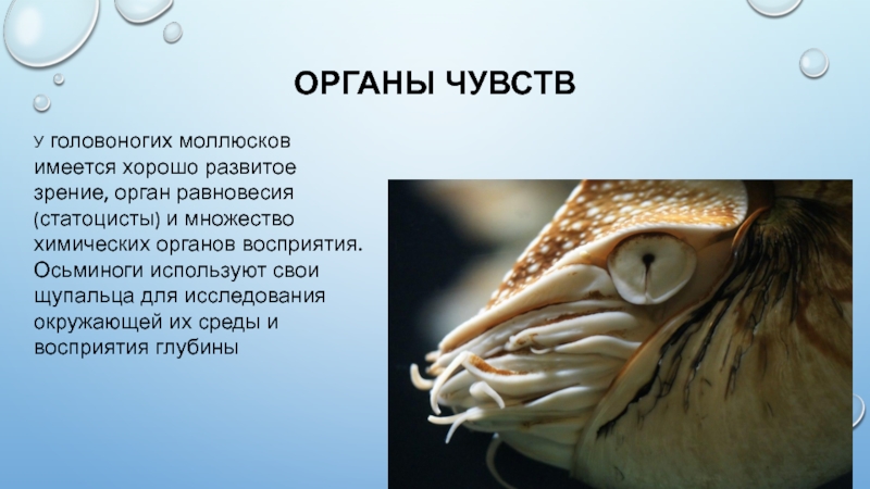 и множество химических органов восприятия. Осьминоги используют свои щупальца для исследования окружающей их среды и восприятия глубины