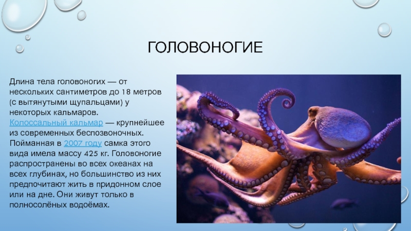 Колоссальный кальмар — крупнейшее из современных беспозвоночных. Пойманная в 2007 году самка этого вида имела массу 425 кг. Головоногие распространены во всех океанах на всех глубинах, но большинство из них предпочитают жить в придонном слое или на дне. Они живут только в полносолёных водоёмах.