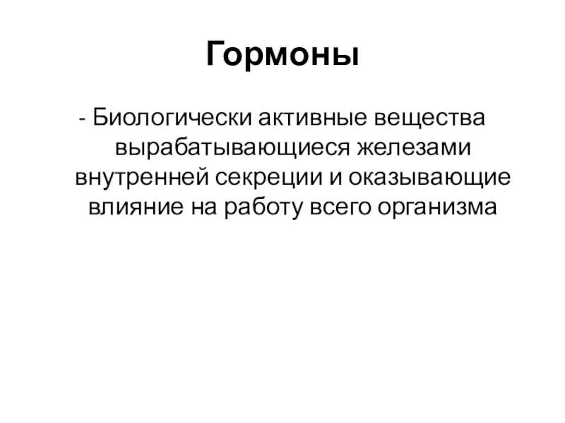 Гормоны- Биологически активные вещества вырабатывающиеся железами внутренней секреции и оказывающие влияние на работу всего организма