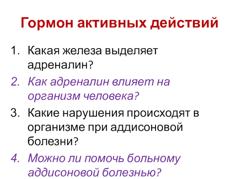 Гормон активных действийКакая железа выделяет адреналин?Как адреналин влияет на организм человека?Какие нарушения происходят в организме при аддисоновой