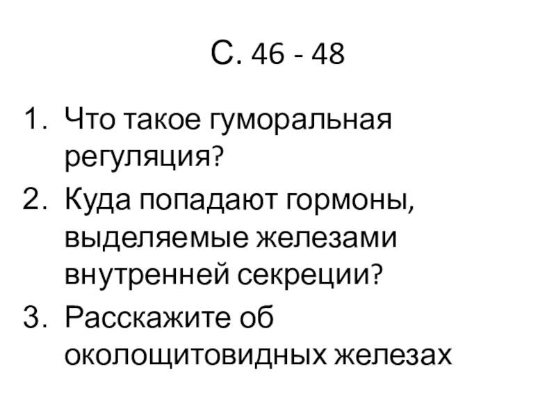 С. 46 - 48Что такое гуморальная регуляция?Куда попадают гормоны, выделяемые железами внутренней секреции?Расскажите об околощитовидных железах