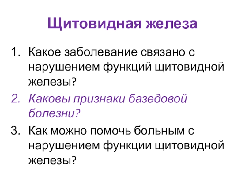 Щитовидная железаКакое заболевание связано с нарушением функций щитовидной железы?Каковы признаки базедовой болезни?Как можно помочь больным с нарушением