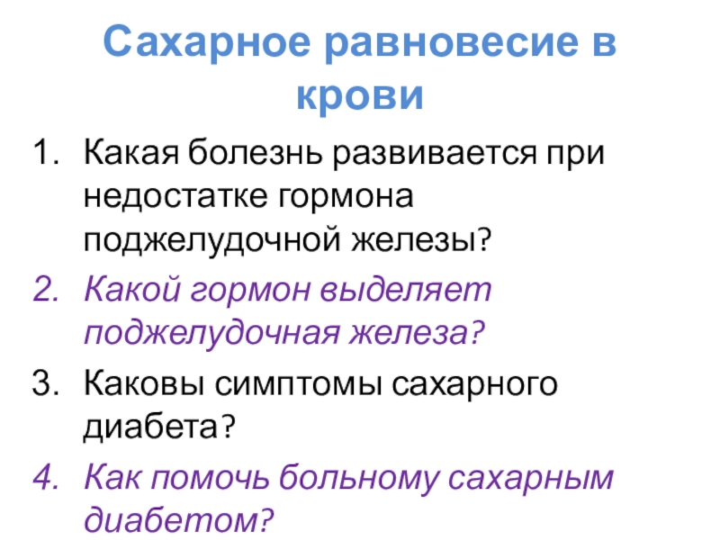 Сахарное равновесие в кровиКакая болезнь развивается при недостатке гормона поджелудочной железы?Какой гормон выделяет поджелудочная железа?Каковы симптомы сахарного
