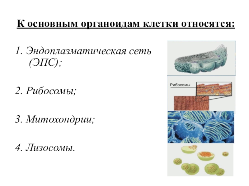 К основным органоидам клетки относятся:1. Эндоплазматическая сеть (ЭПС);2. Рибосомы;3. Митохондрии;4. Лизосомы.
