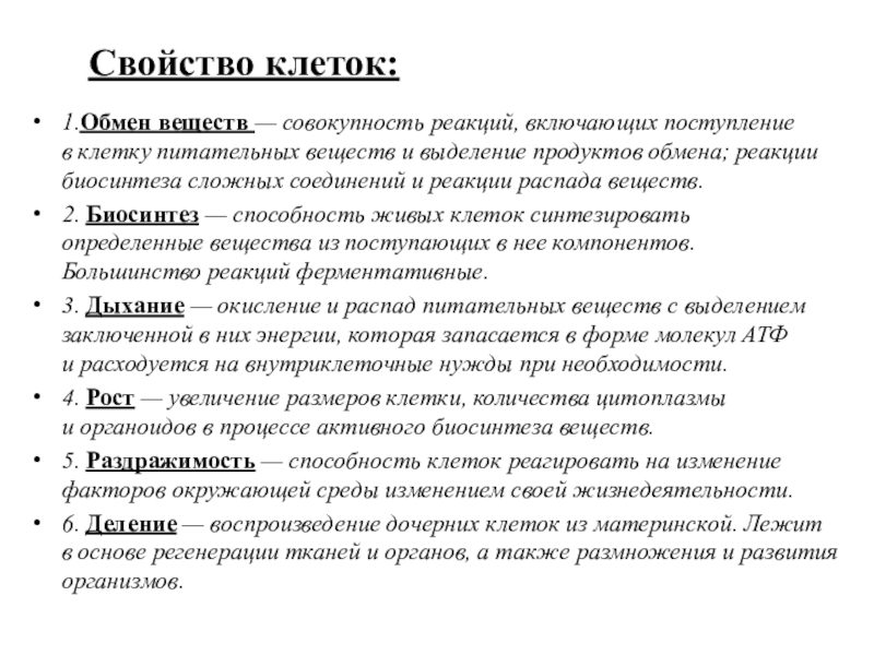 Свойство клеток:1.Обмен веществ — совокупность реакций, включающих поступление в клетку питательных веществ и выделение продуктов обмена; реакции биосинтеза сложных соединений