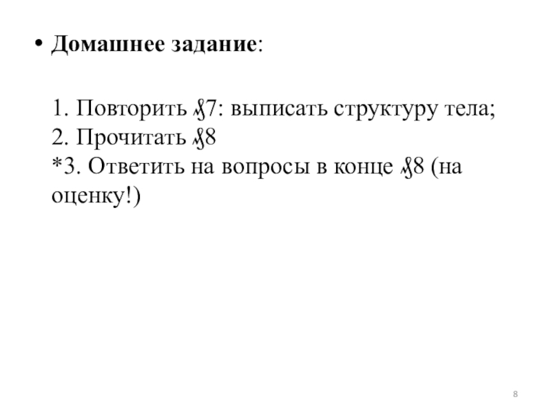 Домашнее задание: 1. Повторить ₰7: выписать структуру тела; 2. Прочитать ₰8 *3. Ответить на вопросы в конце