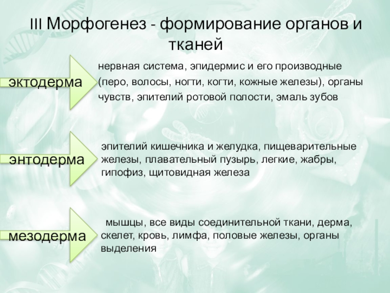 нервная система, эпидермис и его производные (перо, волосы, ногти, когти, кожные железы), органы чувств, эпителий ротовой полости, эмаль зубов