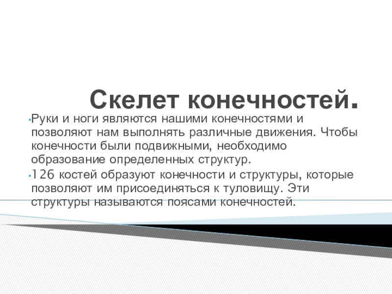 126 костей образуют конечности и структуры, которые позволяют им присоединяться к туловищу. Эти структуры называются поясами конечностей.