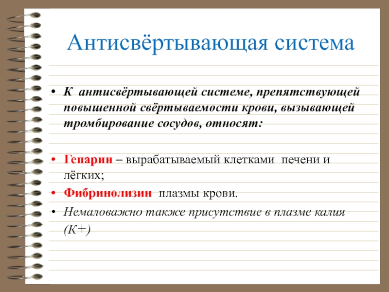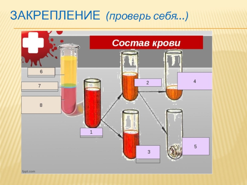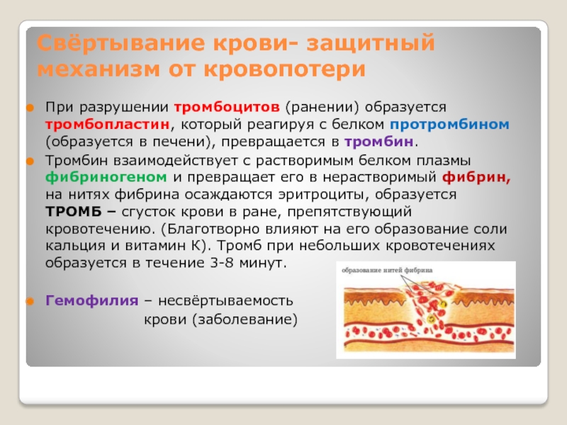 Тромбин взаимодействует с растворимым белком плазмы фибриногеном и превращает его в нерастворимый фибрин, на нитях фибрина осаждаются эритроциты, образуется ТРОМБ – сгусток крови в ране, препятствующий кровотечению. (Благотворно влияют на его образование соли кальция и витамин К). Тромб при небольших кровотечениях образуется в течение 3-8 минут.