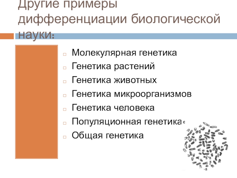 Другие примеры дифференциации биологической науки:Молекулярная генетикаГенетика растенийГенетика животныхГенетика микроорганизмовГенетика человекаПопуляционная генетикаОбщая генетика