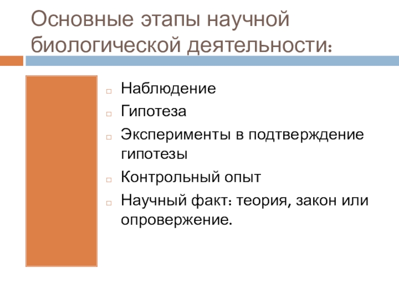 Основные этапы научной биологической деятельности:НаблюдениеГипотезаЭксперименты в подтверждение гипотезыКонтрольный опытНаучный факт: теория, закон или опровержение.