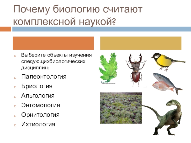 Почему биологию считают комплексной наукой?Выберите объекты изучения следующихбиологических дисциплин:ПалеонтологияБриологияАльгологияЭнтомологияОрнитологияИхтиология