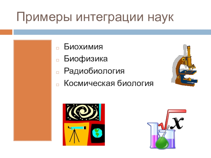 Примеры интеграции наукБиохимияБиофизикаРадиобиологияКосмическая биология