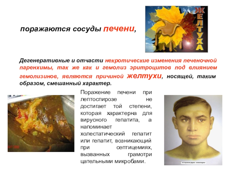 Поражение печени при лептоспирозе не достигает той степени, которая характерна для вирусного гепатита, а напоминает холестатический гепатит или гепатит, возникающий при септицемиях, вызванных грамотри цательными микробами.