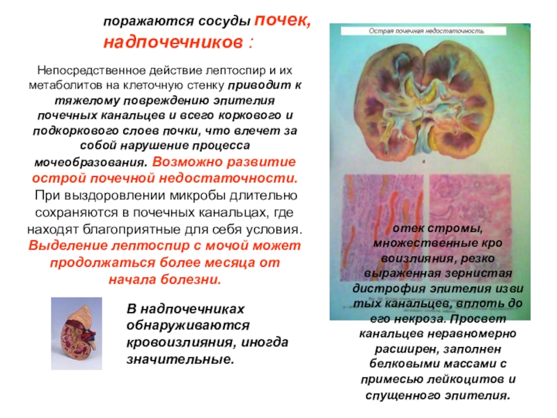 отек стромы, множественные кровоизлияния, резко выраженная зернистая дистрофия эпителия извитых канальцев, вплоть до его некроза. Просвет канальцев неравномерно расширен, заполнен белковыми массами с примесью лейкоцитов и спущенного эпителия.