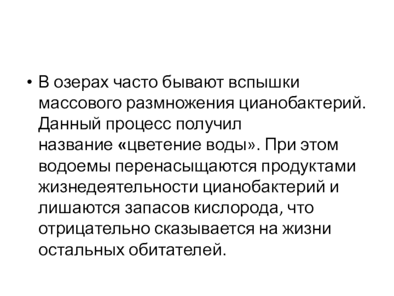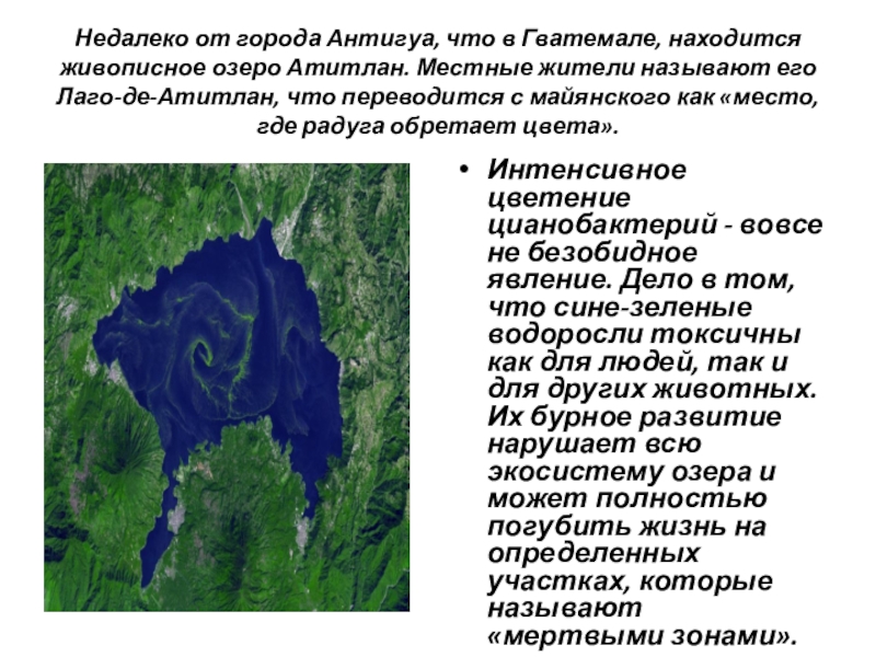 Интенсивное цветение цианобактерий - вовсе не безобидное явление. Дело в том, что сине-зеленые водоросли токсичны как для людей, так и для других животных. Их бурное развитие нарушает всю экосистему озера и может полностью погубить жизнь на определенных участках, которые называют «мертвыми зонами».