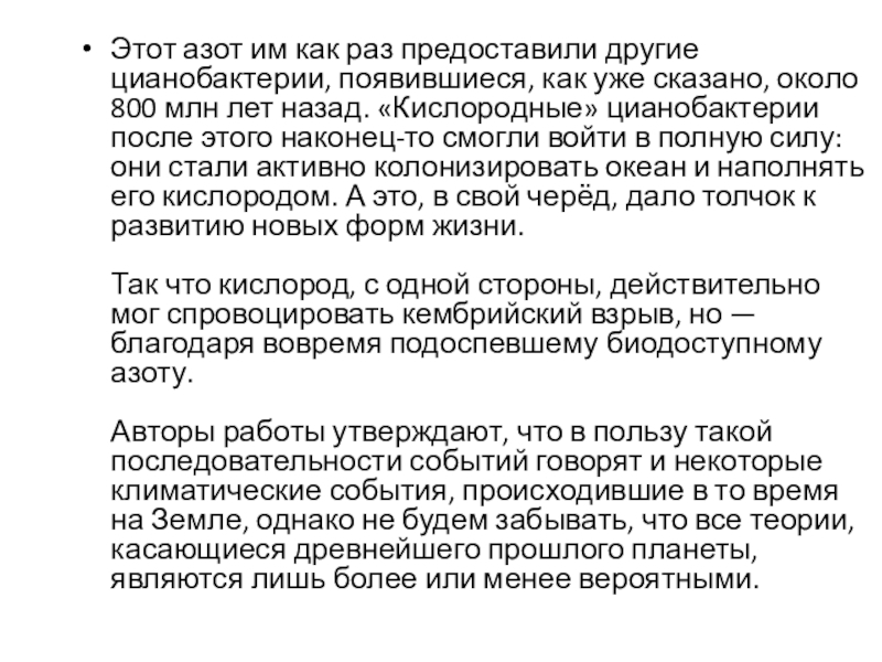 Исследователи из Бристольского университета (Великобритания) полагают, что дело тут было не столько в кислороде, сколько в азоте. Используя генетические данные, они попытались восстановить взаимоотношения между сине-зелёными водорослями, кои, благодаря своему фотосинтезу, могли вызвать в атмосфере значительные перемены и повлиять тем самым на пути эволюции.