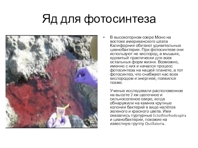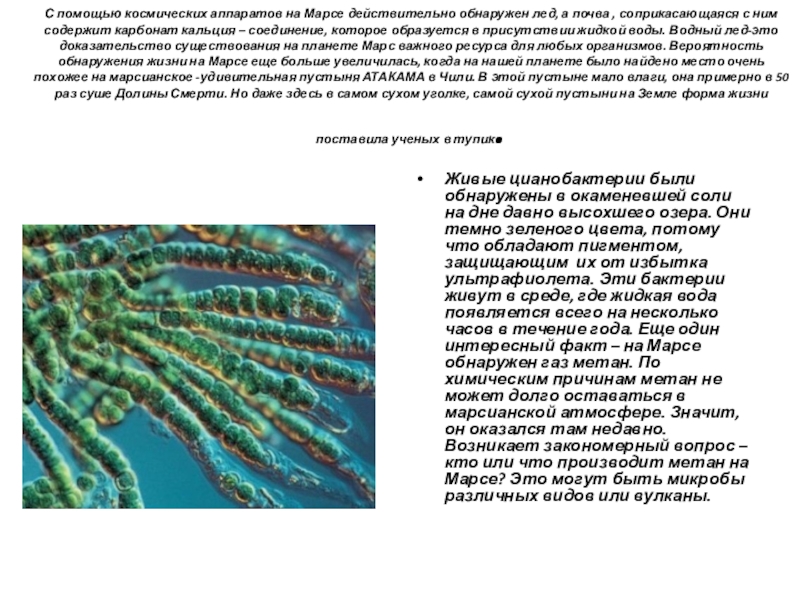 Живые цианобактерии были обнаружены в окаменевшей соли на дне давно высохшего озера. Они темно зеленого цвета, потому что обладают пигментом, защищающим их от избытка ультрафиолета. Эти бактерии живут в среде, где жидкая вода появляется всего на несколько часов в течение года. Еще один интересный факт – на Марсе обнаружен газ метан. По химическим причинам метан не может долго оставаться в марсианской атмосфере. Значит, он оказался там недавно. Возникает закономерный вопрос – кто или что производит метан на Марсе? Это могут быть микробы различных видов или вулканы.