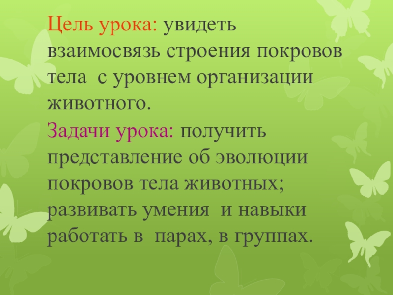 Задачи урока: получить представление об эволюции покровов тела животных; развивать умения и навыки работать в парах, в группах.
