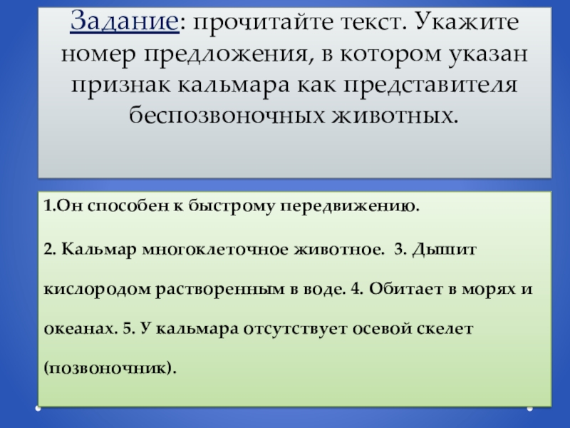 2. Кальмар многоклеточное животное. 3. Дышит кислородом растворенным в воде. 4. Обитает в морях и океанах. 5. У кальмара отсутствует осевой скелет (позвоночник).