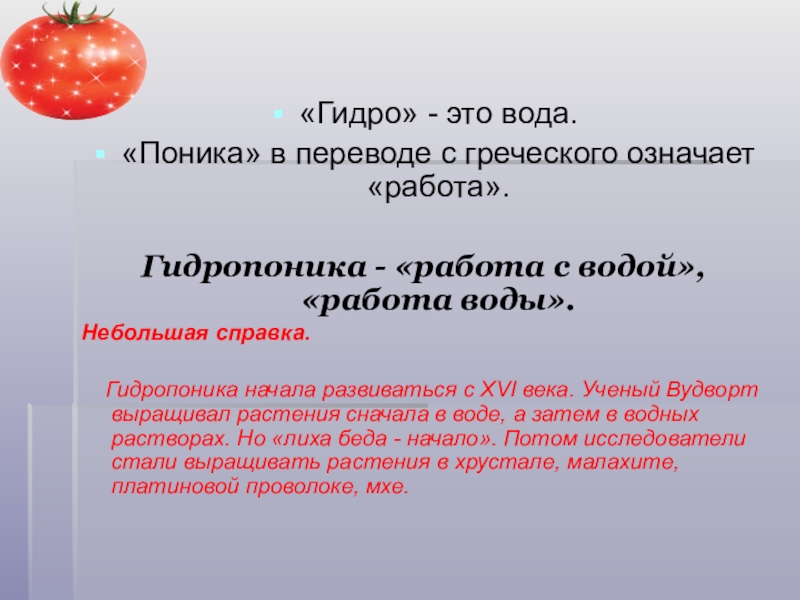 «Гидро» - это вода. «Поника» в переводе с греческого означает «работа».Гидропоника - «работа с водой», «работа воды».Небольшая